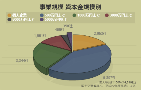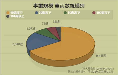 事業者のほとんどが中小企業、保有車両数30両以下の事業者が84.5%、資本金が5000万円を超える事業者はわずか2.5%です。(平成23年3月末現在)