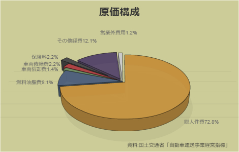 タクシーは人件費が原価の72.8%を占めており、これに次ぐのが石油情勢の影響を受けやすい自動車の燃料費です。(平成22年度実績)